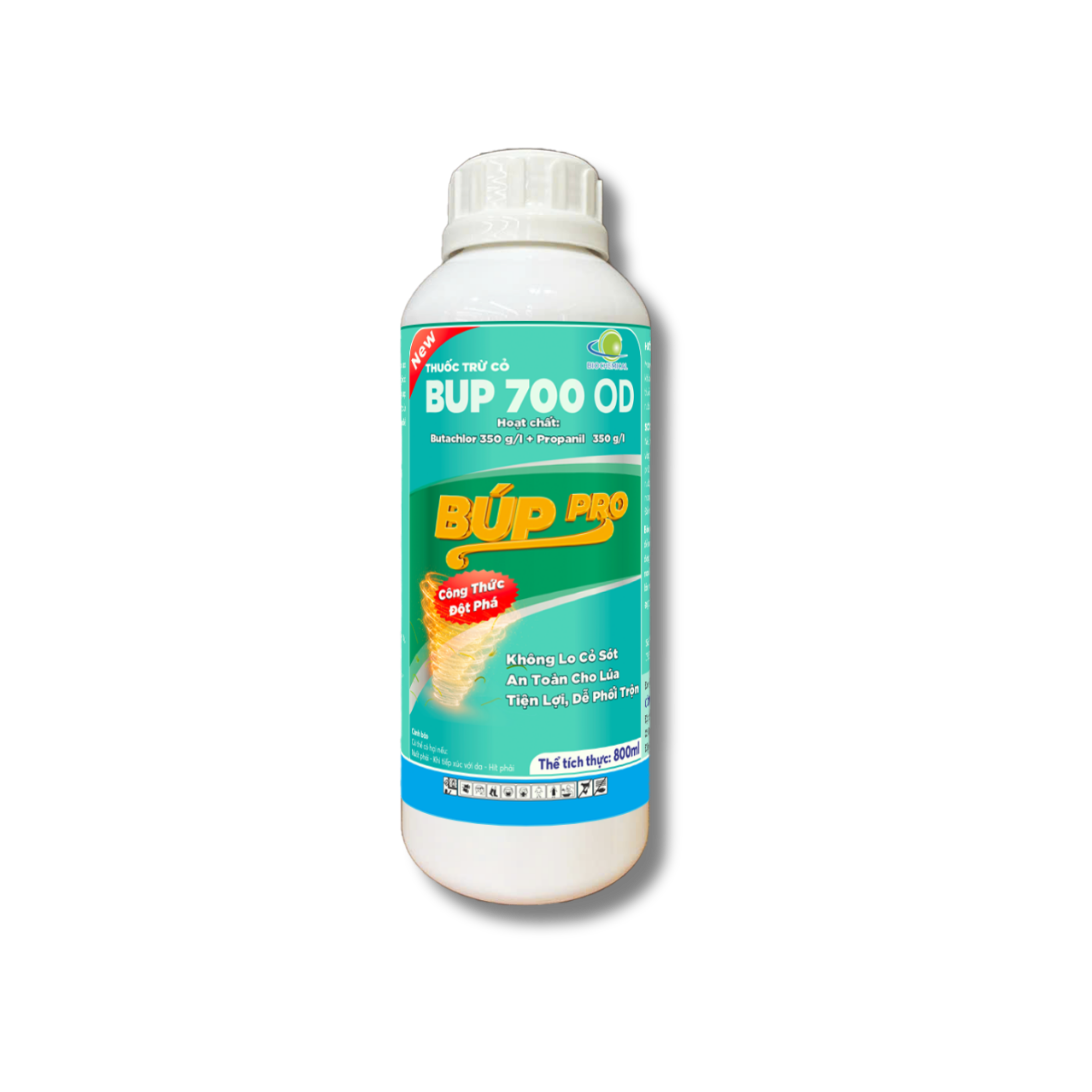 Búp Pro 700 OD là thuốc trừ cỏ dạng OD nồng độ cao, kết hợp tiền hậu nảy mầm. Sản phẩm chứa Butachlor và Propanil, giúp sạch cỏ với hiệu lực mạnh, bám dính tốt, thấm sâu nhanh, ít rửa trôi. Đặc biệt an toàn cho lúa và không lo cỏ sót, nhẹ công.